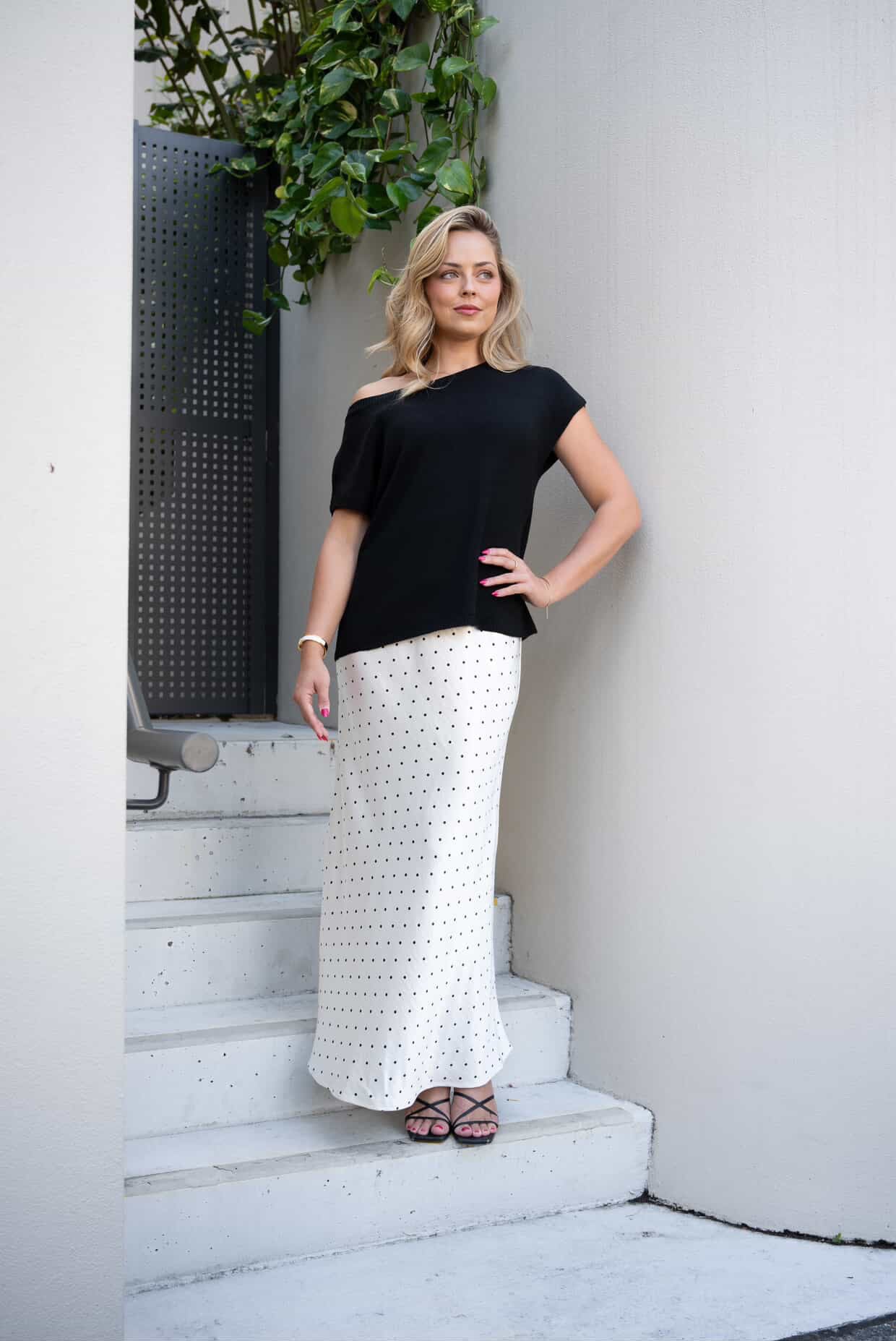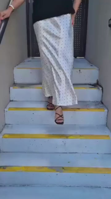 Fall in love with the timeless charm of the Dottie Dreams Satin Skirt. Crafted in a silky, satin-look fabric that glides beautifully with every step, this piece combines playful polka dots with an effortlessly chic silhouette.