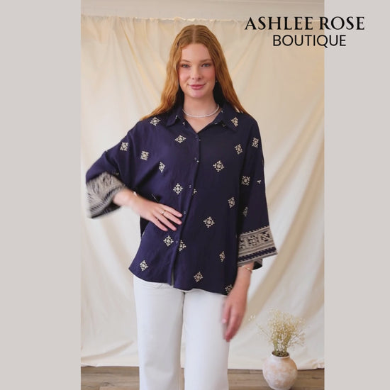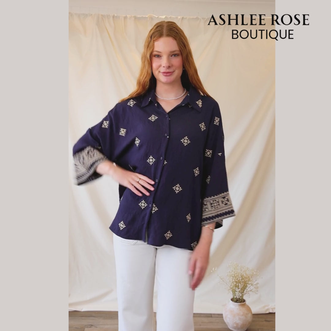 The Sahara Nights Embroidered Blouse is a timeless button-up with a soft drape and a beautiful artisan touch. Featuring detailed embroidery throughout and an intricate patterned cuff, this piece blends comfort with sophistication.