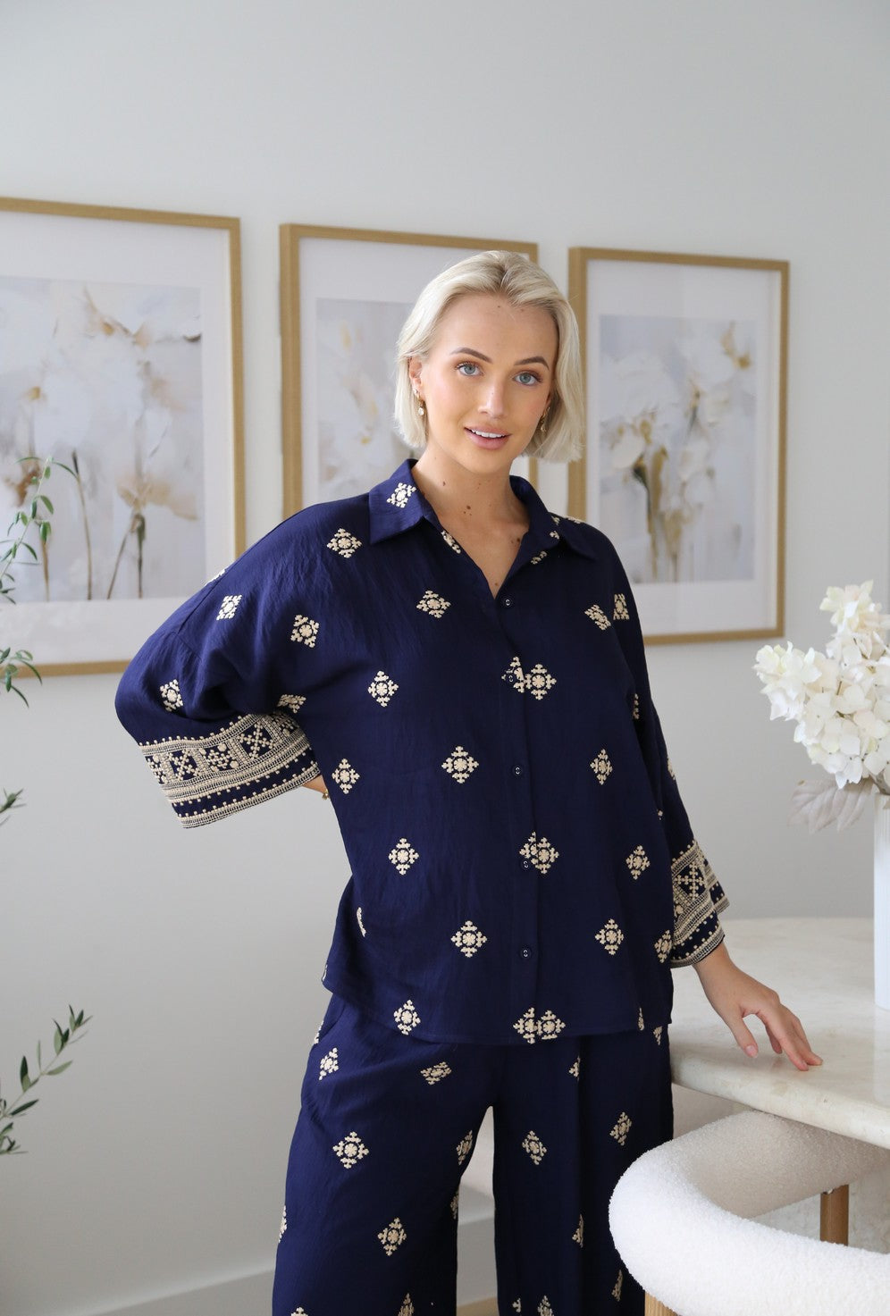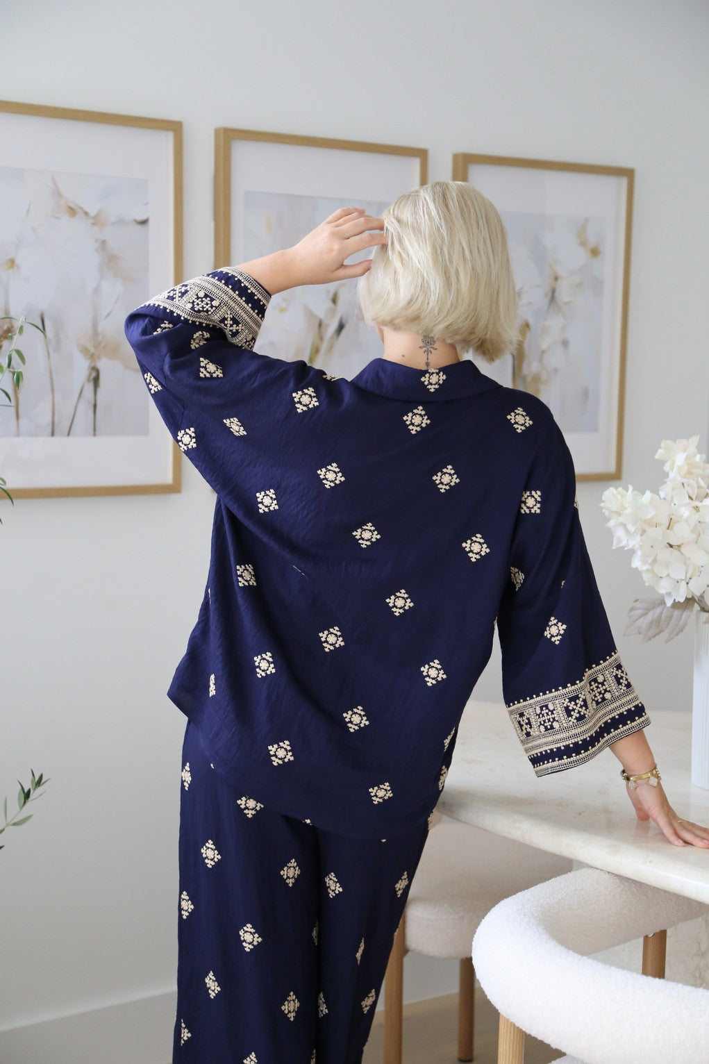The Sahara Nights Embroidered Pants are the perfect mix of relaxed and refined. Made from a lightweight, breathable rayon blend, they feature detailed embroidery throughout and a beautifully patterned hem to match the coordinating blouse.