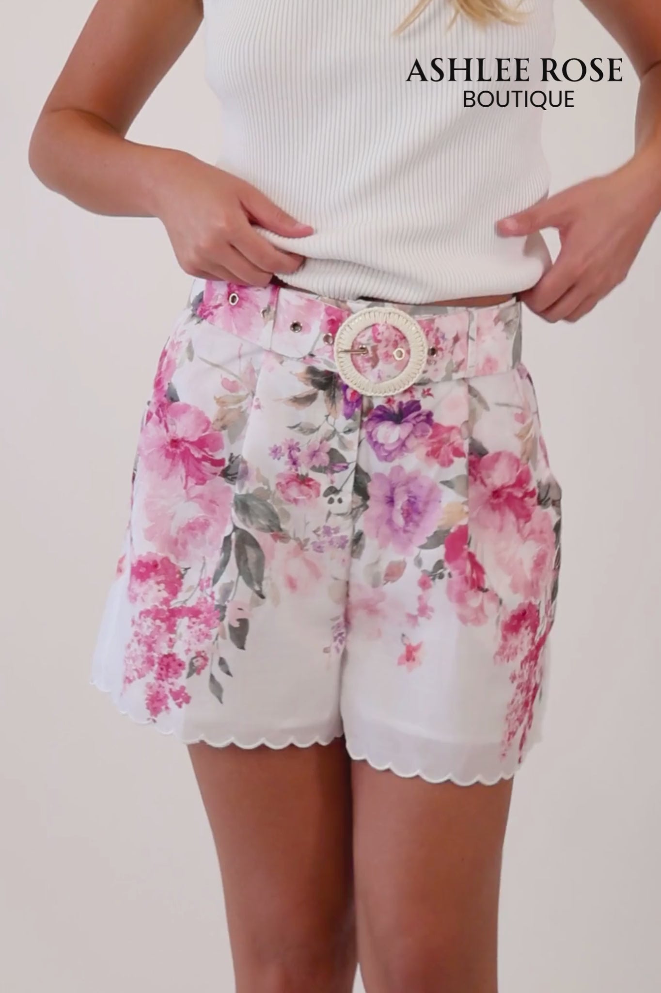 Pretty and playful, the Bloom Kiss Shorts feature a soft floral print with scalloped hems and a chic round belt. Designed in a lightweight linen-blend fabric, they’re perfect for brunch, beach days, or lazy weekends in the sun.