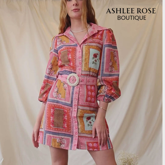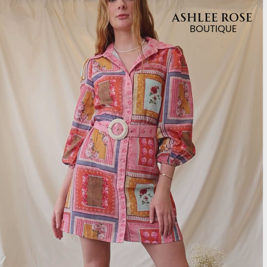The Sweet Peony Patch Dress is full of charm, colour, and personality. Featuring a playful mix of floral prints in soft pinks, warm mustards, and candy stripes, this belted shirt dress brings a vintage-inspired twist to modern styling.